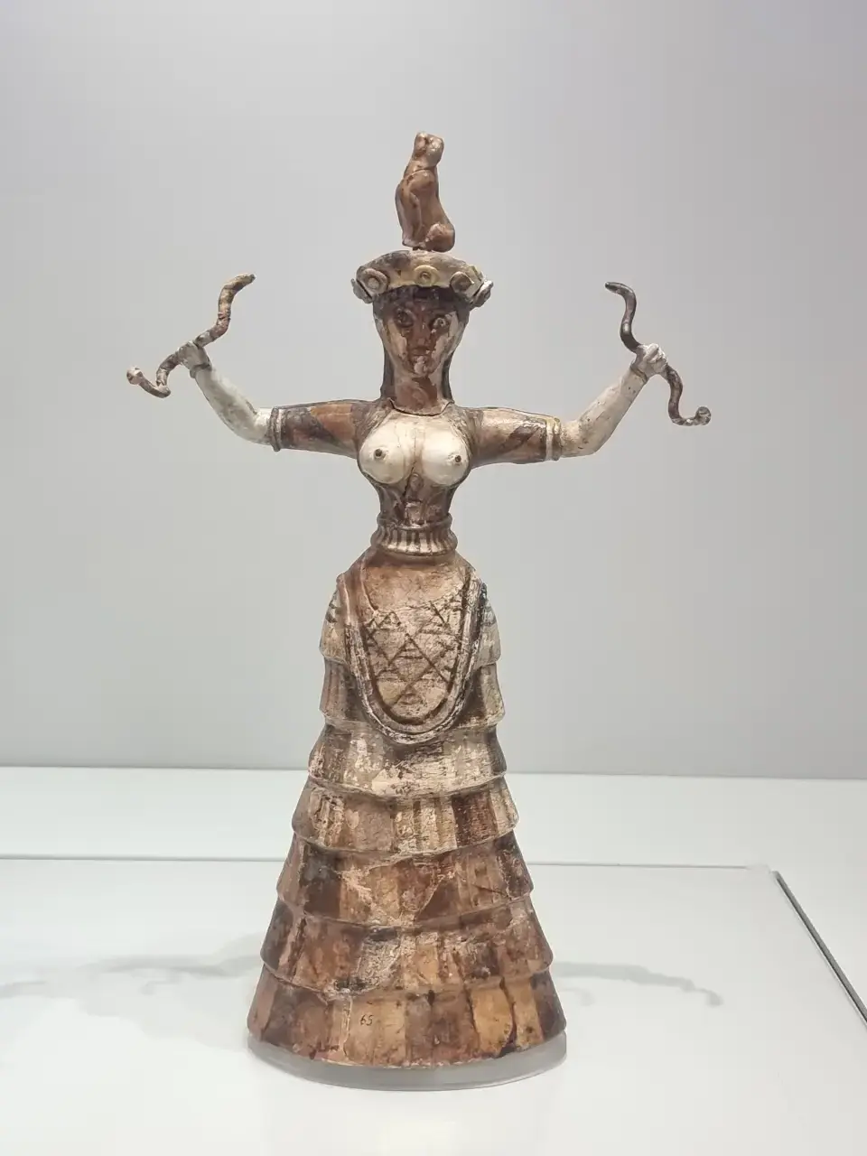Hadí motivy symbolizují chthónický (podzemní) charakter kultu bohyně, zatímco kočkovitá šelma na hlavě menší postavy naznačuje její panství nad divokou zvěří. Bohyně nosí bohaté oděvy — dlouhou volánovou sukni, vyšívanou zástěru a přiléhavý živůtek, který odhaluje velká prsa; ty jsou symbolem plodnosti žen, bohyně a posléze i samotné přírody.