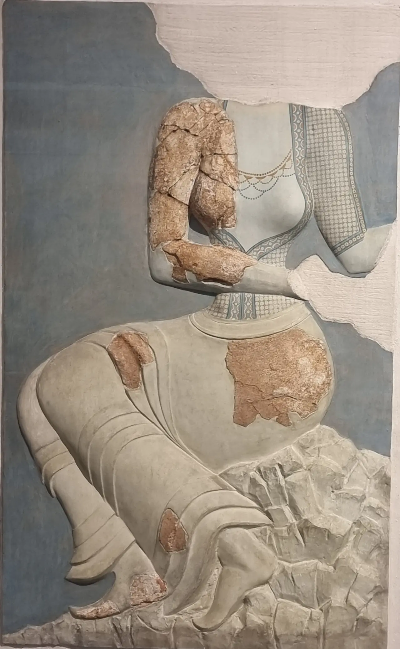 “Dámy v modrém” jsou součástí kompozice bohatě oděných a štědře ozdobených ženských postav zobrazených na modrém pozadí. Ozdoby jejich účesů byly rekonstruovány podle podobného fragmentu fresky. Navzdory fragmentárnímu stavu nástěnná malba přenáší dojem přepychu a blahobytu královského dvora a zároveň odráží koketérii dam, které gesty rukou předvádějí bohatství svých šperků.